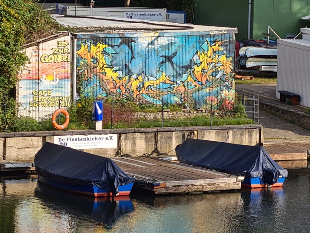 Dies sind unsere wichtigsten Vereinsmitglieder, „Zitronenjette“ und „Aalweber“, hier an ihrem Liegeplatz im Heimathafen am Osterbekkanal an der Straße Kämmererufer / Ecke Großheidestraße.