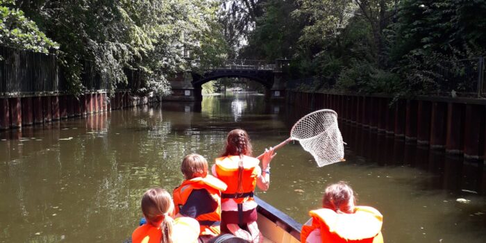 Zwischen April und Oktober befahren wir regelmäßig mit unseren beiden Booten mit Kindergruppen aus Kitas und Schulen die Alster und ihre Nebengewässer und reinigen die Wasseroberflächen und die Ufer von Müll – dem Alstergold.